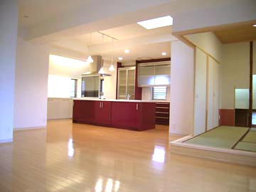 | オーナー住宅のリビングは、掘りコタツのある和室とアイランドタイプのキッチン空間と一体になっており、広々として、開放的な空間になっている。 |