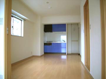 | 賃貸住戸の内装は、白の壁と明るい色のフローリングで仕上げられた。モダンカラーのキッチンがアクセントになっている。 |