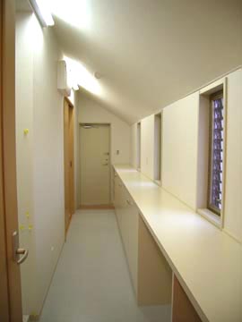 | キッチンの奥には、勝手口と洗面室に抜けるユーティリティ空間があり、大容量の収納カウンターが設けられた。家事やちょっとした作業など、いろいろな使い方ができるようになっている。 |