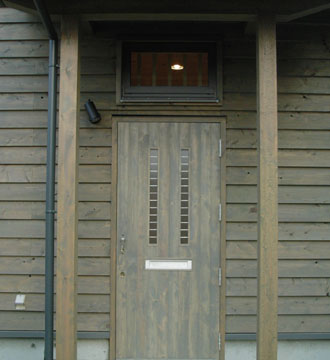桧材で作られた玄関ドアと外壁。