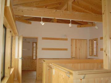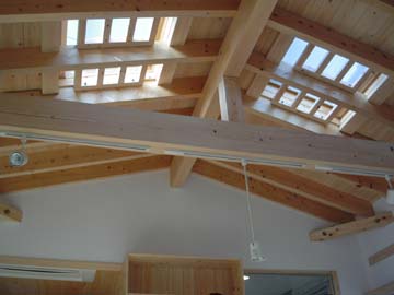 2階のホール。天井は、全てひのき材でつくられた屋根組みを、そのまま現しにしている。