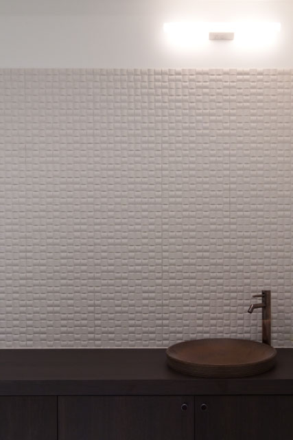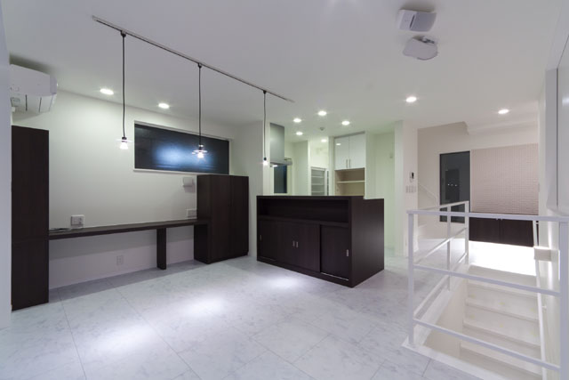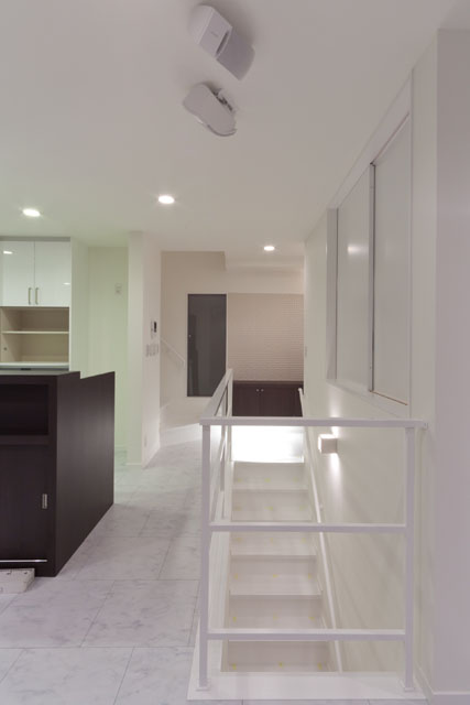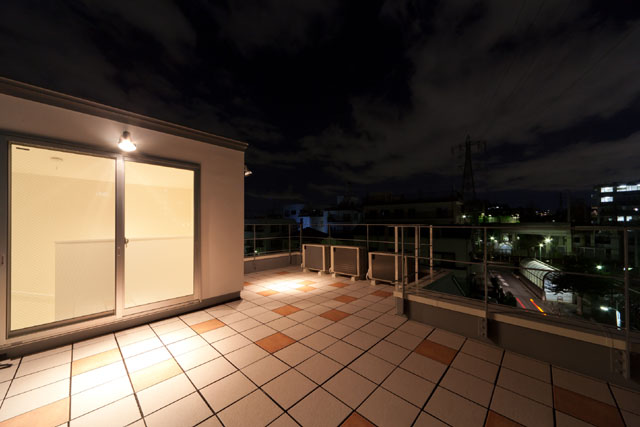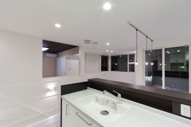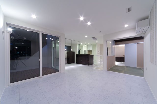 個室群を1・3階に配置し、リビングのある2階を開放的な一室空間としている。リビング空間はコーナー窓や外部に設けたウッドデッキによって外部へと視線が広がる開放的な空間になっている。