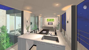 南側の自然あふれる景色の広がる風景と、2つの中庭に挟まれて配置されたLDK空間は開放感にあふれる。夜はライトアップされることでより神秘的な空間になる。