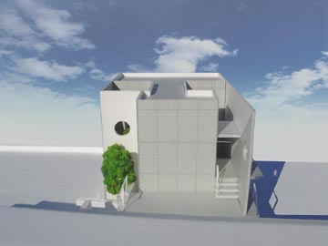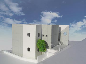 コンクリート打ち放しの壁面と白色の壁面を組み合わせた外観。