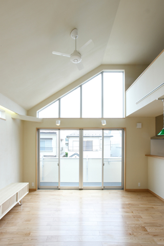 南北を道路に面した敷地に建つ個人住宅。シンプルなプランとすることでお施主様の要望するスペースがコンパクトにまとめられている。リビングをロフト・和室と繋げることで開放的な空間になっている。