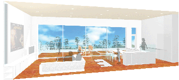 リビングダイニング空間は天井高さ3.5mのフラット空間になっており、大パノラマ開口からは、緑の向こうに海を望むことができる。