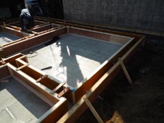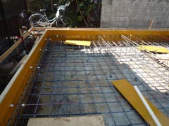 ↑基礎は地盤調査の結果、柱状改良+ベタ基礎という仕様になっています。当社ではプラン確定時に地盤調査を行い、調査に基づいた基礎工法を用いることで地盤保障を受ける、という形で進めております。右の写真は基礎の立ち上りの型枠工事の様子でアンカーボルトの埋め込みをしています。構造金物用には異形アンカーを使用します。