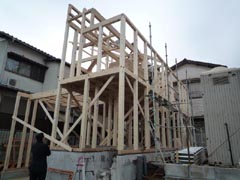 ↑上棟した様子です。今回は在来軸組工法を採用しています。在来軸組工法は柱と梁を組んで建物をつくる工法で、2×4工法よりプランが自由に作れるのが特徴です。敷地間口が狭く隣家が迫っている敷地でしたので、今回は在来工法の良さを活かし建物のコーナーに大きな窓をとって明るく快適な空間をつくりました。また、当社では建物の外周部に耐力壁を集中させることで、将来的な間取りの変更がしやすいような設計をしています。