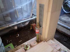↑構造金物の取付の様子です。左の写真のボルトは基礎のコンクリートに埋め込まれていて、地震の時に柱が土台から抜けてしまうのを防ぎます。大きな地震や台風にも耐えられるよう、しっかりと金物で部材同士を緊結していきます。構造上重要なポイントで、当社では全箇所必ずチェックを行っています。