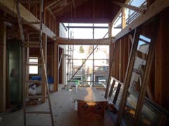 ↑サッシ(窓)を取付け、壁と天井の下地をつくっているところです。写真はリビングの様子です。東側に大きな窓を設け、また東側から隣家が迫っている南側にかけて連続したハイサイド窓を設けました。