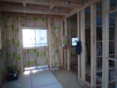 ↑断熱材を施工したこころです。今回は壁の断熱材にはグラスウール10K・100mm厚のものを使用しました。住宅の断熱の目安としては、住宅性能評価の等級3(省エネ基準:熱抵抗0.8)と等級4(次世代省エネ基準:熱抵抗2.2)がありますが、グラスウール100mmは、低コストでありながら熱抵抗2.0と等級4に迫る性能があり、コストパフォーマンスが良い材料といえます。