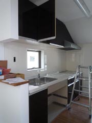 ↑内部の仕上工事の様子です。今回は用途が賃貸住戸ですので住人の入れ替えに伴うリフォームが簡単に出来るように壁天井は壁紙で仕上げています。床にはキズや汚れにつよいフローリングを使用しています。