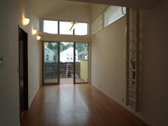左の写真:明るい吹抜けのあるリビングです。上部にはロフトがついています。